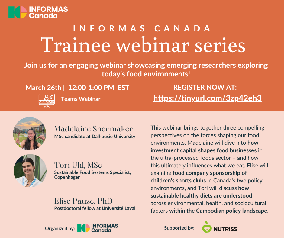 The INFORMAS Canada Trainees’ Webinar Series is a trainee-focused initiative designed to foster connections within the INFORMAS Canada community and the broader global INFORMAS network. This series provides emerging researchers in food environments with an opportunity to present their work, engage with the wider research community, and exchange ideas with peers.
